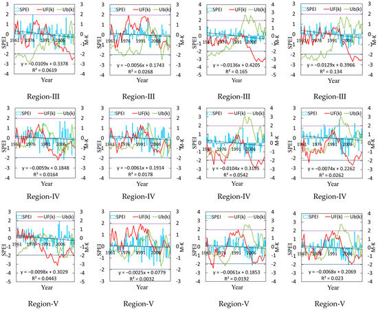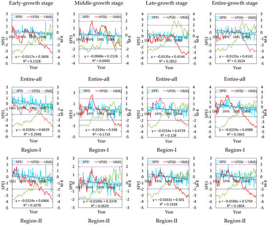 Interannual variation in SPEI and Mann-Kendall mutation test for various regions in Inner Mongolia during crop growth seasons from 1961 to 2020. Note: UF = Upward Trend Statistic; UB = Backward Trend Statistic. Note: The dark blue parallel lines and purple parallel lines denote the 0.05 significance level, with the black diagonal lines representing trend lines.