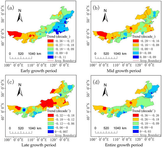 From the perspective of spatial distribution, the drought evolution in the spring maize areas of Inner Mongolia over the past 60 years can be depicted more intuitively. The spatial distribution of the SPEI climatic tendency rates during different growth stages of spring maize is shown in Figure 3. Notable differences in SPEI variations were observed among the different regions during the early, middle, and late growth stages, as well as the entire growth period of spring maize. The areas where drought intensification was more significant during the early growth stage were mainly located in Regions I and II in Western Inner Mongolia, with an average SPEI climatic tendency rate of −0.23 decade−1. Areas such as Guaizi Lake, Ejina Banner, Dengkou, and Urad Frontier Banner showed rates below −0.3 decade−1. The regions where droughts showed a significant reduction were mainly located in the Chifeng area within Region III, with a climate tendency rate above 0, accounting for 14% of the total number of stations. The regions where the drought trend intensified significantly during the mid-growth period are mainly found in Region I, with an average climate tendency rate of −0.19 decade−1. The stations where the drought trend eased were mainly distributed in Regions III and V, with 20 stations accounting for 18.6% of the total number of stations. During the late growth period, all climatic regions exhibited an increasing drought trend, with only three stations showing an increasing trend in SPEI, whereas the remaining areas showed a worsening drought trend. The regions with significant drought trends were mainly distributed in the Xilin Gol League within Region III. Throughout the entire growth period, all other stations exhibited a worsening drought trend except for Zhungeer Banner in Region III and Zhalantun in Region IV, which showed a drought mitigation trend. The regions with significant intensification were mainly distributed throughout Region I, parts of the Xilin Gol League, and the Hulunbeir League within Region III.