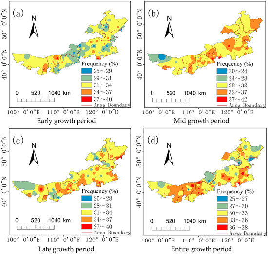 where Pi is the frequency of disaster occurrence; N is the total number of years of statistical data for this site; n is the total number of years in which disasters occurred at the site or the number of years in which disasters occurred at different disaster levels. To record the number of occurrences of different drought severity levels annually during the spring maize growing stage, we calculated the frequency of these drought levels throughout the crop growth period.