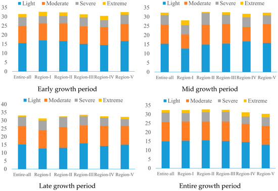 To clarify the characteristics of drought frequency in different climatic regions of Inner Mongolia during the growth period of spring maize, spatial distribution maps for various growth stages were created (Figure 4). A summary of the frequency of drought occurrence at different severity levels in each climatic region during the spring maize growth period is shown in Figure 5. During the initial growth stage, the lowest drought frequency areas were mainly distributed in the Wulanchabu region of Region III, whereas the highest drought frequency areas were Wulate Middle Banner in Region II and Baotou, Chifeng, and Ningcheng in Region III, with values exceeding 36%. Among the various climatic regions, Region I had a relatively high overall drought frequency (32%), whereas Region IV had a relatively low frequency (30.46%). During the mid-growth stage, the areas with higher frequencies of drought occurrence were mainly distributed in Shangdu and Taipusi Banner in Region III. Areas with lower drought frequencies (below 25%) included Ejina Banner in Region I and Ejin Horo Banner in Region III. Among the various climatic regions, Region I had a relatively low overall frequency of drought, whereas Region II had a higher frequency. During the late growth stage, the overall trend of drought frequency was lower in the western region and higher in the central and eastern regions than in other regions. Areas with higher drought frequencies were located in Hohhot in Region III, whereas areas with lower frequencies were found in Xinbarhu Zuoqi and Wushen Banner in Region III and near Linhe in Region II. Among the various climatic regions, Region I had a relatively low overall frequency of drought, whereas Region III had a generally higher frequency. Throughout the entire growth period, the drought occurrence frequency was relatively high in Mandula and Wulate Zhongqi in Region II, as well as in Zhalute Banner and Aohan Banner in Region III, with a frequency of 38%. The frequency is relatively low in places such as the Sonid Right Banner and Linhe in Region II and Zhalantun in Region IV. Among the various climatic regions, the overall drought frequency was relatively high in the entire region, Regions I, II, and III and relatively low in Regions IV and V. In general, during the spring maize growing period in Inner Mongolia, the drought frequency in various climatic regions exhibited characteristics of a higher occurrence of light and moderate droughts, the lowest occurrence of extreme droughts, and a moderate occurrence of severe droughts. Among all the growth stages, the mid-growth stage exhibited the highest drought frequency.