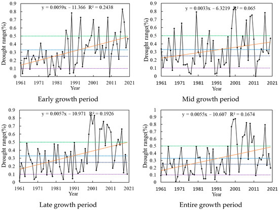Using the drought station occurrence ratio to represent the scope of disaster occurrence during the growth period of spring maize in the region, a higher station occurrence ratio indicates a larger scope of drought. Figure 6 illustrates the statistical results for the drought scope during different growth periods. The drought scope during each growth period exhibited a significant increasing trend (p < 0.05), with a relatively large increasing trend observed during the initial growth period at a rate of 0.059 decade−1. During the initial growth period, over the past 60 years, there were 9 years that experienced no significant drought. In the remaining years, localized drought was the most frequent, occurring in 18 years and primarily in the 1960s and 1970s. Partial regional drought was relatively infrequent, occurring in 9 years. Regional and widespread drought occurred over 13 and 11 years, respectively, mainly after the 1990s. The largest drought coverage occurred in 2017, affecting 83% of the area. The drought scope during the mid-growth period ranged from 0 to 85%. Localized drought occurred most frequently, affecting 22 years, whereas partial regional drought occurred least frequently, affecting only 6 years. Regional and widespread drought occurred in 14 and 11 years, respectively, mainly in the 2010s.