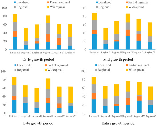A compilation of the occurrence scope of different drought severity levels across the entire study region and its various climatic regions is illustrated in Figure 7. During different growth stages, localized and regional droughts predominantly occurred across the entire region. However, widespread droughts were more prevalent in most regions except Region III, which experienced a relatively large drought scope, exceeding the 76% occurrence range. Region I experienced a lower scope of drought during the early and middle growth stages, Region II experienced a lower scope of drought during the late growth stage, and Region V had the lowest scope of drought throughout the entire growth period. Except for Region III, during the early and middle stages of crop growth, the occurrence of widespread drought was extensive across all climate regions during different growth periods. Partial regional droughts were mainly distributed in Regions II, III, and IV during the early, middle, and entire growth periods, respectively.