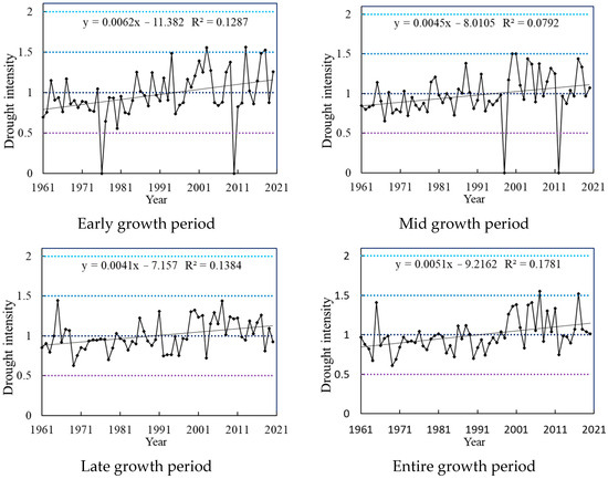 Drought intensity during spring maize growth in Inner Mongolia over the past 60 years is summarized in Figure 8. Drought intensity during the initial growth stage of spring maize ranges from 0 to 1.56, with a climatic tendency rate of 0.062 decade−1, indicating a significant increasing trend in drought intensity (p < 0.05). The maximum drought intensity occurred in 2013, which was classified as a severe drought, whereas the minimum drought intensity occurred in 1976 and 2010, representing normal years. Mild drought accounted for 58% of the total, moderate drought for 20 years, and severe drought for 3 years, specifically in 2003, 2013, and 2018. During the mid-growth period, the climatic tendency rate of drought intensity was 0.045 decade−1, indicating a significant increasing trend. The drought intensity ranged from 0.65 to 1.51, with an average of 0.97, categorizing it as mild drought. The maximum drought intensity occurred in 2001, which was classified as severe drought, whereas 1998 and 2012 were normal years. Mild and moderate droughts accounted for 56% and 38% of the total years, respectively. During the late growth period, the drought intensity mainly fluctuated between mild and moderate drought, ranging from 0.62 to 1.44. The average drought intensity over multiple years was 1, categorizing it as moderate drought. The drought intensity showed an increasing trend, with 35 and 25 years of mild and moderate drought, respectively. The climatic tendency rate of drought intensity across the entire growth period was 0.051 decade−1 years, indicating an overall significant increasing trend. The drought intensity ranged from 0.60 to 1.55, fluctuating between mild and severe drought, except for 2007 and 2017, which were classified as severe drought years. Mild drought accounted for 61% of the total, whereas moderate drought accounted for 35%.