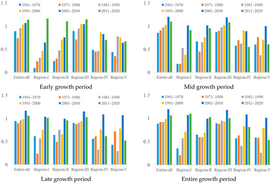 The interdecadal drought intensity in various climatic regions during the spring maize growth period is shown in Figure 9. During the early growth stage, the average drought intensity in the entire region and Region III was <1 during the 1960s, 1970s, and 1980s, indicating mild drought conditions. After the 1990s, moderate drought conditions became more prevalent. Regions I and II transitioned from normal years and mild droughts in the early periods to moderate drought conditions after the 2010s. Regions IV and V had predominantly normal years in the early periods, subsequently transitioning to mild drought conditions in the 1990s and the 1980s, respectively. During the mid-growth stage, the entire region and Region III experienced mild drought conditions before the 1990s, which shifted to moderate drought conditions thereafter. In Regions I, II, and V, the drought intensity in the 2010s was >1, indicating moderate drought years. Region I experienced normal conditions in the early period, whereas Regions II and V were predominantly characterized by mild droughts. The average drought intensity across different decades in Region IV ranged from 0.5 to 1, falling into the category of mild drought. During the later stages of reproduction, the entire region and Region III experienced mild drought before the 2000s, which shifted to moderate drought thereafter. Region I experienced moderate drought in the 2000s and 2010s, with the 1970s characterized as normal. Mild drought was the primary condition in other decades. Region II consistently experienced mild drought across the decades, with intensity ranging from 0.5 to 1. Regions IV and V experienced moderate drought in the 2000s and normal conditions in the 1980s, whereas mild drought was the main condition in other decades. Throughout the entire growth period, in the entire region, Regions II and III experienced mild drought before the 2000s, which shifted to moderate drought thereafter. Region I had a drought intensity of >1 in the 2000s and the 2010s, categorizing it as moderate drought; the other decades were predominantly normal years or mild drought. Regions IV and V experienced moderate drought in the 2000s, normal conditions in the 1980s, and mild drought in other decades.