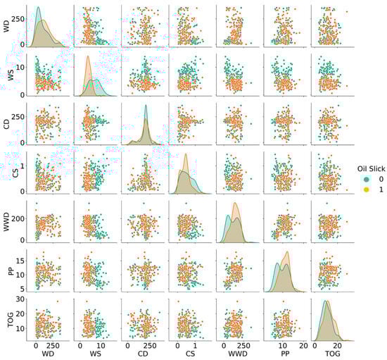 Figure 1 presents the classification of data based on the presence or absence of an oil slick, as a function of the predictor variables of WD, WSD, CS, WWD, PP, and TOG, showing that the problem is not a linear classification problem. Therefore, it is more suitable for machine learning models that account for non-linearity between predictor variables and the binary response, defined here as the occurrence or not of oil slicks.