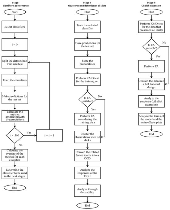 The methodology adopted in this study encompasses three main stages. The first stage involves evaluating the performance of five classification algorithms: RF, KNN, MLP, BLR, and SVM, as mentioned before. In the second stage, the influence of meteoceanographic variables and TOG levels on the probability of oil slick occurrence and detection (Pos) is analyzed. Finally, the third stage examines the extent of the detected oil slick to identify contributing factors. Figure 2 illustrates the methodological flowchart, detailing the steps undertaken in this research.