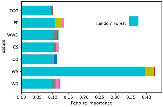 The random forest (RF) algorithm demonstrated the best performance among the evaluated methods, as depicted in Figure 3. As a result, it was selected for use in Section 4.2. To gain a deeper understanding of the influence of predictor variables on the occurrence and detection of an oil slick, the feature importance graph generated by the RF model was analyzed and stored. This graph provides valuable insights into the contribution of each variable to the prediction process, supporting a more informed interpretation of the model’s outcomes.