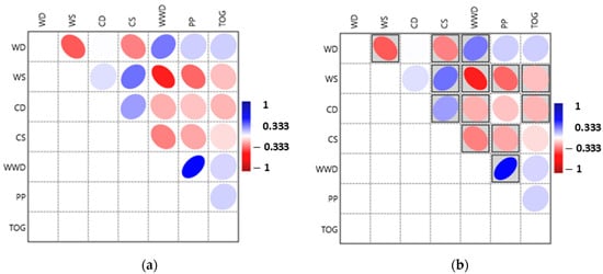 (a) Correlation plot; (b) correlation plot with p-value < 0.05 boxed.