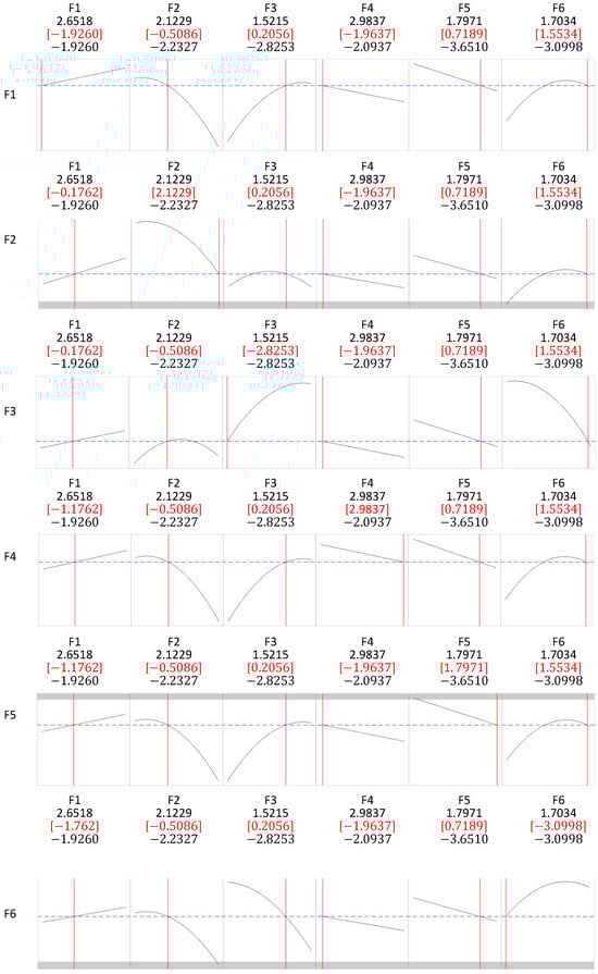 To gain a deeper understanding of the effects associated with each variable, the response optimizer available in Minitab software (version 19, https://www.minitab.com) was employed. A target value of 0.4 was set for , with all the factors held constant except for one, which was allowed to vary at a time. This approach aimed to isolate and assess the impact of each variable on , as illustrated in each row of Figure 7.