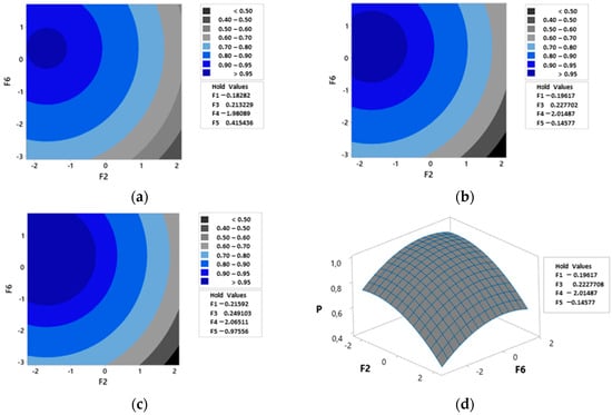 At this stage, factor analysis was not performed as previously mentioned. It is important to emphasize that the dataset used here differs from the one employed in Section 4.2, since data without the occurrence of an oily feature were excluded. The linear model demonstrated good performance, prompting the conversion of the data into a customized full factorial array. Table 5 presents the coded coefficients associated with each term of the linear model, along with the p-values obtained through the WLS algorithm. The model achieved and values of 86.78% and 86.7%, respectively, indicating a good fit to the data.
