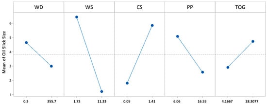 Since the model does not include interactions or quadratic effects, it was possible to evaluate the main effects plot presented in Figure 9. The plot reveals that higher values of WD, WS, and PP are associated with a decrease in the mean extension of the oil slick. On the other hand, increases in CS and TOG lead to a greater extension of the oil slick. These observations highlight the distinct impact of each variable on the phenomenon under study.
