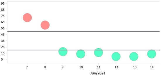 Considering that the probability of a given response variable Y belongs to class 1, given an input variable vector composed of p elements, the equation can be represented by . Also assuming the logit function for this problem, as shown in Equation (A3), it is possible to obtain the probability by using Equation (A4) [46].