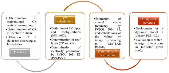 This investigation focuses on establishing the interconnection between the water requirement and the performance of PV panels on green roofs. To these ends, initially, we identify the water consumption of conventional green roofs and determine the reduction in water requirement in the shade. This is based on an extensive database of the water consumption of green roofs in sunlight and shadow according to literature reviews, integration of shadow frequency simulation in PVSOL 2024 R3 [92], image processing in MATLAB R2024b [93], and dynamic simulation in Vensim PLE 10.2.1 [94]. For this purpose, the different configurations of bio-solar green roofs were defined, 48 simulations were carried out, and a code for image processing in MATLAB R2024b was developed. Following this, a database for the efficiency of different PV solar panels and the enhancement due to the decrease in the temperature on the panels installed on green roofs was compiled. In the next step, the database was used to develop a dynamic decision support system in Vensim PLE 10.2.1. Accordingly, using the dynamic model, the influence of PV panels on the green roof water requirements (due to shaded areas by PV panels) and the effect of green roofs on the PV panel annual production (due to temperature modification) was evaluated. The analysis of the shadow frequency of PV panels on the roof is a geographic parameter that depends on the location, weather conditions, and installation inclination of PV panels. Consequently, as applied in this study, a long-term simulation (as in this research, the MeteoNorm 8.2 database of 2001 to 2020) can be the most effective analytical technique, and additional experiment validation will not affect the results. A schematic of the methodology is shown in Figure 1, and a schematic of the PV–green roof concept is shown in Figure 2.