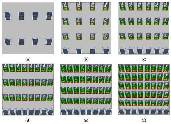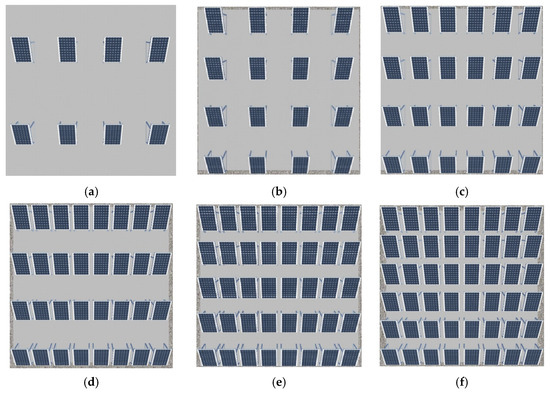 Various configurations of PV panels on the green roof: (a) 10% coverage area; (b) 20% coverage area; (c) 30% coverage area; (d) 40% coverage area; (e) 50% coverage area; (f) 60% coverage area.