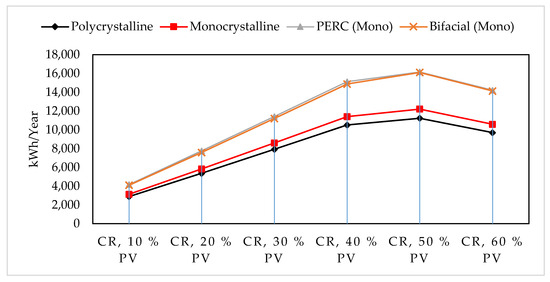 Annual electricity production with different configurations (type and percentage of PVs) on the conventional roof (CR).