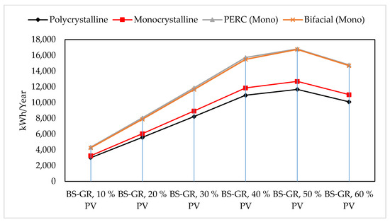 Annual electricity production with different configurations (type and percentage of PVs) on the bio-solar green roof (BS-GR).