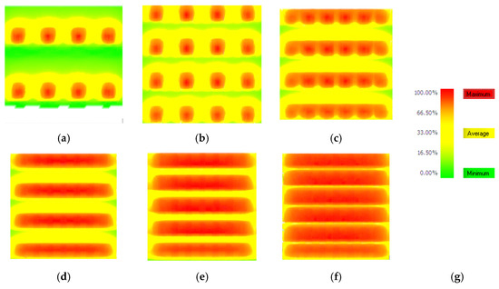 Annual shade frequency of PV panels on green roof surfaces: (a) 10% coverage area; (b) 20% coverage area; (c) 30% coverage area; (d) 40% coverage area; (e) 50% coverage area; (f) 60% coverage area; (g) shade frequency legend. (Maximum: 100% shade frequencies; Average: 33% shade frequencies; Minimum: near 0% shade frequencies).