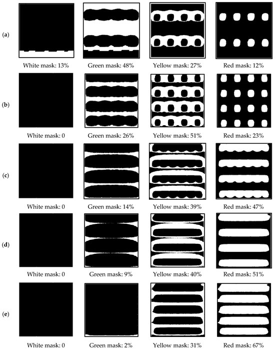 To determine the amount of the area in each zone, the annual shade frequencies of PV panels on the green roof surface were analyzed using the image-processing technique in MATLAB R2024b. The developed code is provided in Appendix A. Figure 8 shows the contribution of each shade frequency in various configurations of PV panels on the green roof. The figure shows that the white mask (0% shade frequency) is only present in the 10% PV coverage area configuration, as can also be detected in Figure 7a. The green mask (near 0% shade frequency) was reduced with the PV coverage area increase. The green mask is at 48% and 0% for the 10% and 60% coverage areas, respectively. The yellow mask (33% shade frequency) increased up to 51% at a 20% PV coverage area and decreased to 10% at a 60% PV coverage area. Meanwhile, the red mask (100% shade frequency) increased constantly from 12% to 90% as the coverage area of solar panels increased.