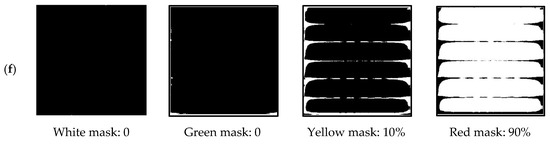 Image processing analysis and the percentage of each mask determined by MATLAB R2024b: (a) 10% PV coverage area; (b) 20% PV coverage area; (c) 30% PV coverage area; (d) 40% PV coverage area; (e) 50% PV coverage area; (f) 60% PV coverage area.