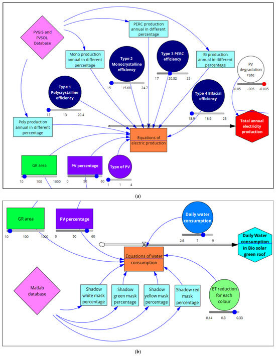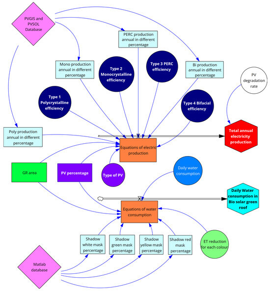 - Step 6 (generalizing the results by developing a dynamic model): In this stage, the databanks in step 5 can be used to provide a dynamic analysis model in Vensim PLE 10.2.1 software. The input of the Vensim PLE 10.2.1 can be single data, tables, or graphs. For example, it can be the minimum or maximum efficiency of polycrystalline modules or green roofs’ water consumption in different climates. Therefore, in this stage and for our case study, according to the results of PV production (by 48 simulations in PVSOL 2024 R3), the data can be added based on the type of module, type of roof, percentage of the PV on the roof, etc. The same can be performed for water consumption by green roofs in the Mediterranean climate, for the decline in water demand (ET reduction for each color of shadow provided by PVSOL 2024 R3, and amounts based on percentages of the roof area in MATLAB R2024b) with a full shadow and 33% shadow;