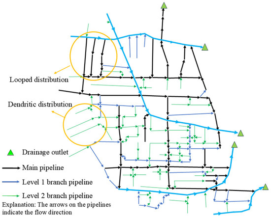 (1) Fundamental information regarding the drainage pipeline network was obtained from the Zhengzhou Municipal Engineering Management Office. The studied area’s pipeline network is configured in two deployment methods: looped and dendritic. The pipelines tier can be classified into main pipelines, level 1 branch pipelines, and level 2 branch pipelines. Reinforced concrete and double-wall bellows pipelines comprise the pipeline material, with a predominantly circular cross-section. Specifically, the main pipeline, level 1 branch, and level 2 branch have diameters of 1000–2500 mm, 500–1000 mm, and 300–500 mm, respectively. An overview of the drainage network is shown in