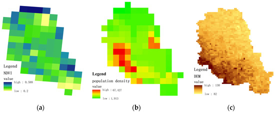 (3) Land use data were obtained from a geospatial data cloud in which NDVI (Normalized Difference Vegetation Index) was acquired by the Agua/Terra-MODIS satellite at a resolution of 500 m × 500 m. The study area had a maximal NDVI value of 0.588 and a minimum value of 0.2. The land use is shown in