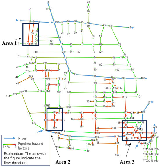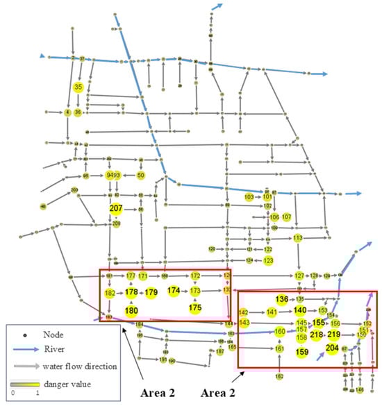 Figure 14, the majority of pipeline network nodes in the northern region of the study area have a risk degree of less than 0.244, which is considered low. The high volume of garbage generated from adjacent streets has resulted in the silting of individual nodes (e.g., 35, 94, etc.). The pipeline network’s intersection area and the vicinity of the river’s confluence are the primary locations of high-risk nodes in the southern region. These nodes exhibit clear high centrality characteristics (Area 1 and Area 2). The node risk is elevated in nodes that are situated near rivers (e.g., 155, 218, 219, etc.), as they typically receive water from multiple pipelines, resulting in the accumulation and expansion of silt. The overall flow path of the network may be significantly impacted if a node malfunctions as a result of severe siltation in the connecting pipeline. Furthermore, nodes such as 178, which serve as transit nodes in the network, accumulate sediment from the upstream nodes 180 and 179, which in turn become nodes with elevated risk values.