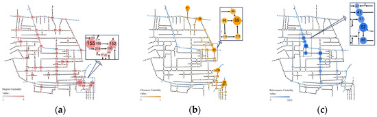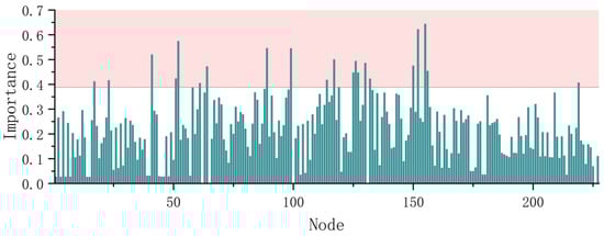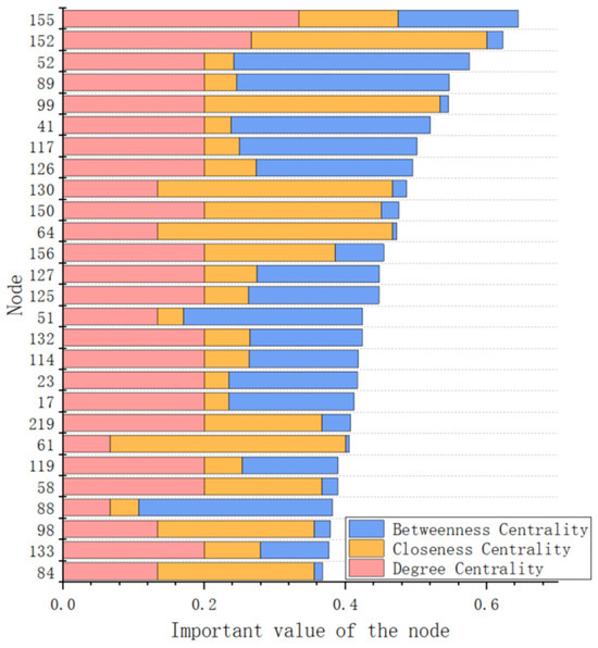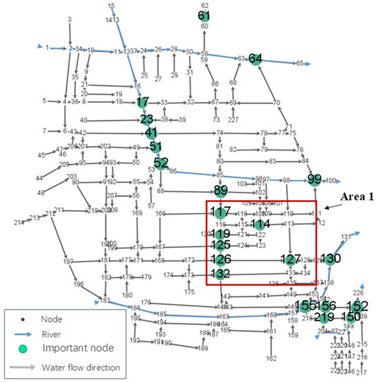 Figure 11. The remaining 15 critical nodes are situated immediately adjacent to the river or drainage discharge. In Area 1, the critical node is primarily responsible for the downstream water discharge. The critical node with the highest importance in this area is 127, with an importance of 0.448. Critical nodes 155 and 152, which are adjacent to the river, exhibit the highest importance and exhibit superior degree centrality, closeness centrality, and betweenness centrality. They are the crucial intersections where the drainage network converges to the river. Concurrently,