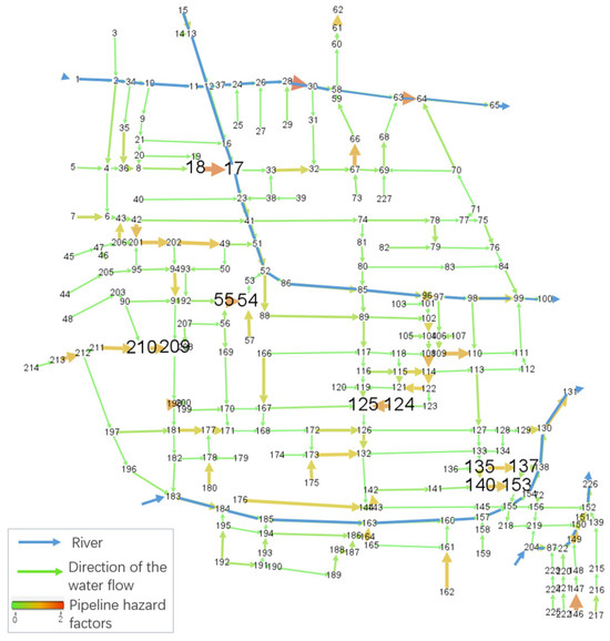 Figure 16, the risk degree of the siltation chain edges of the drainage pipeline network progressively increases from the pipelines farther away from the river toward the river. The high-risk edges are situated in the main pipelines downstream of the drainage network, where they are highly vulnerable, due to the accumulation of silt in the pipelines as a result of long-term confluence. The lower-risk edges are primarily distributed in the branch pipelines, with some of them (e.g., side V