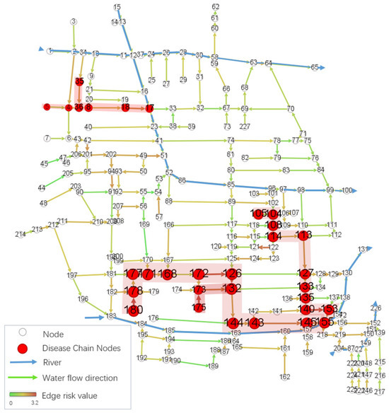 Figure 16 indicate that secondary pipelines with high levels of siltation exhibit a greater propagation risk, and that the siltation propagates in the direction of the water flow—namely, from secondary branches to main pipelines. Therefore, this approach offers a more precise identification of risks associated with silt transfer to downstream sections. Secondly, the research prioritizes critical nodes within the siltation chain, particularly multi-branch intersections (e.g., node 178) and river-entry nodes (e.g., node 155). These nodes exhibit significantly higher risk values and serve as critical nodes for silt transmission and accumulation. Proactive siltation management at these nodes is essential to mitigate further propagation and systemic chain reactions. Third, a novel aspect of the study is the quantitative ranking of high-risk pathways, identifying core areas and key propagation paths critical to the drainage network’s stable operation. The significance of this path may be attributed to the fact that critical paths are typically located in the main drainage pipelines or confluence areas, where water from multiple branch pipelines converges. This convergence results in reduced flow velocity in certain sections, leading to sediment accumulation. Additionally, these areas are often associated with high population density, where waste from surrounding residential areas (such as plastic bags and food scraps) can easily enter the drainage system and mix with sediment, forming more persistent and stubborn deposits. For example, the edge V180→V178 is identified as the primary propagation pathway of the disease chain due to its high pipeline risk factor and vulnerability, while pipelines with lower risk factors (such as V214→V213) indicate less sediment accumulation and, consequently, a lower risk of siltation propagation. Therefore, this quantitative analysis not only provides a scientific basis for prioritizing dredging but also offers a clear direction for the long-term maintenance and optimization strategies of the drainage system.