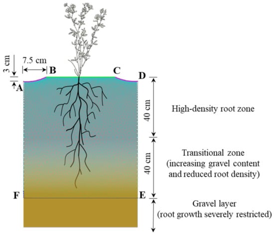HYDRUS-2D was used to develop a numerical model of soil water movement under the MDI system for alfalfa. This model was used to investigate soil water dynamics, alfalfa root water uptake, deep percolation, total irrigation amount, and soil surface evaporation throughout the entire growing cycle through the MDI system. The simulation focused on the two-dimensional vertical soil profiles between adjacent mobile drip lines to study soil water movement. As shown in Figure 2, the computational domain in HYDRUS-2D is defined as a rectangle with a width EF equal to the drip-line installation distance (L) and a depth of 80 cm. The mobile drip lines are located at the top-left (A) and top-right corners (B) of the computational domain. Our previous studies [11] indicated that the relative movement of high-flowrate mobile drip lines during irrigation generated localized water accumulation along their paths. This process often resulted in shallow depressions along the soil surface beneath the drip lines, with a maximum depth of approximately 3 cm and a maximum width of approximately 15 cm. To accurately represent this effect, the infiltration boundaries AB and CD were designed as curves. As the crop had a restricted root system due to the presence of a gravel layer at the depth of 80 cm, water leaving the bottom boundary of the computational domain was regarded as deep percolation. The flux across this free drainage boundary was integrated over time to estimate the cumulative deep percolation during the growing cycle.