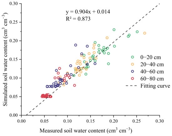 Numerical simulations for all of 2022 were performed based on the conditions of the field experiments. The model was preliminarily validated by comparing simulated and measured soil water content at corresponding times and locations. Figure 3 compares simulated and measured soil water contents throughout the alfalfa growing season, with an overall R2 of 0.873, demonstrating a strong model fit. Figure 4 illustrates temporal variations in simulated and measured soil water content under the experiment conditions in 2022. Seven irrigation events were applied during the growing season, with a cumulative irrigation amount of 269 mm, while the total effective rainfall for the year was 254 mm. During the alfalfa growing period, the soil water content in the shallow layer fluctuated significantly with irrigation or rainfall, whereas the soil water content in deeper layers remained nearly constant before heavy rainfall. The primary simulation errors in shallow soil layer occurred after irrigation or rainfall, where the simulated soil water content was slightly lower than the measured values. However, the temporal patterns of soil water content throughout the growing season exhibited a high degree of consistency between simulated and measured values. Soil water content in deeper layers exhibited minimal fluctuations throughout the alfalfa growing season but was overestimated in the simulations during heavy rainfall events. This discrepancy may be attributed to surface runoff occurring during heavy rainfall under the actual field conditions, leading to reduced water infiltration into deeper soil layers compared to the simulated values.
