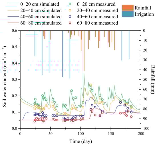 Temporal variations in simulated and measured soil moisture content, with rainfall and irrigation events as a reference.