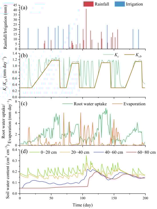 Temporal variations in key indicators throughout the alfalfa growing season: (a) rainfall and irrigation; (b) alfalfa crop coefficient (Kc) and basal crop coefficient (Kcb); (c) root water uptake and evaporation; (d) soil water content at different depths.
