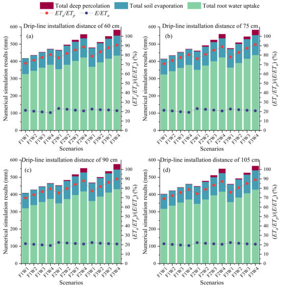 Numerical simulation results for different irrigation thresholds and irrigation depths across four drip-line installation distances: (a) 60 cm; (b) 75 cm, (c) 90 cm, and (d) 105 cm. ETa, ETp, and E represent the actual evapotranspiration, potential evapotranspiration, and evaporation, respectively. F1, F2, and F3 represent deficit irrigation thresholds of 45–50% FC, 55–60% FC, and 65–70% FC, respectively. W1, W2, W3, and W4 represent irrigation depths of 70% W, 85% W, 100% W, and 115% W, respectively. The irrigation amount (W) was determined based on the difference between the average soil water content in the planned wetting layer at irrigation initiation and 90% FC.