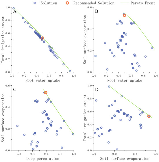 From a practical physical perspective, reducing the total irrigation amount can simultaneously decrease soil surface evaporation and deep percolation, indicating that these objectives may be synergistically optimized in reality. However, Pareto fronts still appear between objectives that do not directly conflict in Figure 7C,D. This may be due to the characteristics of multi-objective optimization: this study included four optimization objectives, and the sparse distribution of solutions in a high-dimensional objective space can lead to local non-dominance in projecting solutions onto one plane, thereby forming a Pareto front. On the other hand, there was a complex nonlinear relationship between the objective functions and the independent variables in this study. Even if two objectives can be synergistically optimized in reality, the “mathematical conflict” in the model may still result in the emergence of a Pareto front. Consequently, the Pareto fronts obtained in this study are reasonable. With respect to production application, different trade-off solutions can be selected based on actual needs, such as prioritizing crop yield or minimizing the total irrigation amount, thereby enhancing the practicality and decision support capability of this study.