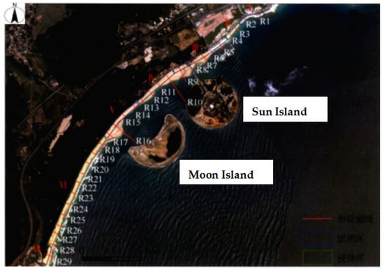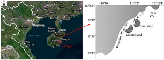 The artificial island is located on the southeast side of Riyue Bay in the southern part of Wanning City, with coordinates ranging from 18°36′14.33″ to 18° 36′27.75″ north latitude and 110°11′27.63″ to 110°11′39.46″ east longitude, as shown in Figure 1. The construction and development of this coastline began in 2012, with the construction of two artificial islands, Sun Island and Moon Island, located approximately 350 m outside the coastline. The total reclaimed land area is about 971,000 square meters, with Sun Island covering about 480,000 square meters and Moon Island covering about 491,000 square meters. The artificial island covers the nearshore waters with a water depth range of −5.0 m~−10.0 m, and the bay is mainly composed of fine sand with D50 = 0.14~0.18 mm.