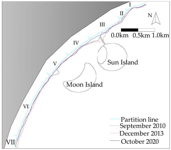 According to the satellite image, the impact of the artificial islands on the adjacent beaches is characterized by “sedimentation behind the island and erosion on both sides”, and there are significant differences in the response amplitude of erosion hotspots on both sides. Overall, the beach exhibits characteristics of stable, eroded, silted, relatively stable, slightly eroded or silted, eroded, and silted erosion and sedimentation from north to south.