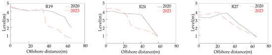 RTK GPS was used to conduct on-site measurements of the terrain of 29 profiles in October 2020 and March 2023, with the profiles arranged from north to south as R1~R29 (shown in Figure 4). By drawing profile maps of different periods, the topographic changes in the Riyue Bay beach profile were compared and analyzed, as shown in Figure 5.