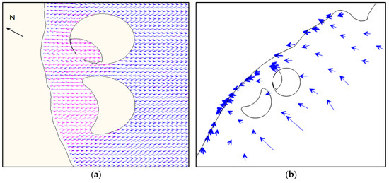 In order to reveal the mechanism of beach erosion after the construction of the artificial islands, on-site surveys and previous research results on hydrodynamics before and after the project were analyzed. Based on the results of each, we concluded that the beach erosion was mainly caused by three influencing factors, according to the angle of passive force. After the construction of the artificial islands, the direction of the waves deviated, and the distribution of the wave energy was uneven, and after the interaction between the Sun and Moon Islands, the northeast side of the shield area of Moon Island was smaller than the southwest side; that is, the dynamic field on both sides of the artificial island changed, which directly affected the sediment transport. The dynamic changes before and after the project are shown in Figure 6a. From the perspective of material sources, due to the obstruction of artificial island bridges and the influence of the natural reef terrain on the northeast side of the Japanese island, the sediment on the northeast side cannot replenish the erosion hotspot area on the southwest side, resulting in a large annual net sediment transport and sediment transport gradient. The sediment transport in the artificial island area is shown in Figure 6b. In terms of the shoreline morphology, the shorelines of regions VI and VII protrude slightly towards the open sea, making them susceptible to wave energy accumulation, resulting in erosion and retreat of the central shoreline in the region.