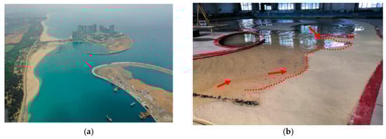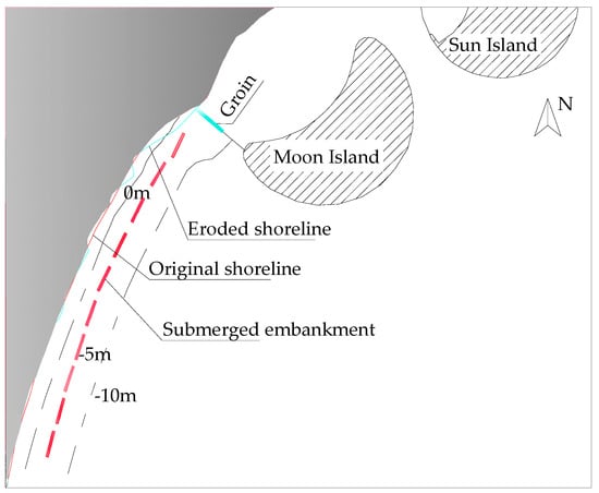 The construction of artificial islands not only alleviates the shortage of coastal land resources but also brings new environmental problems. It not only significantly changes the regional marine dynamics [9,10] and water and sand environment [11,12,13] but also has a significant impact on the distribution pattern of landforms near the coast, especially adjacent beaches [14,15,16,17,18]. The impact of artificial islands on beaches is essentially similar to the effect of offshore levees. The wave shadow area behind the levee causes sediment deposition due to weakened dynamics, while the two sides of the levee cause beach erosion due to strong dynamics. Until now, most research has focused on the scale of sediment deposition behind the embankment (island) to determine whether it has formed a sand mouth or connected island sandbar [19,20,21,22]. In fact, the largest threat of artificial islands to adjacent coastal beaches is the continuous erosion of both sides of the shoreline [23], which must be controlled or repaired by corresponding engineering measures.