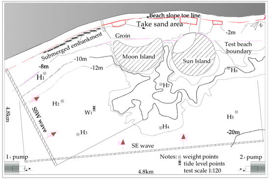 (2) Experimental simulation scope: Based on the experimental purpose and the size limitations of the experimental harbor, a normal scale model was adopted, and the scale relationships of various physical quantities are summarized in Table 1. The experiment was conducted in a harbor basin measuring 45 m in length, 40 m in width, and 1.0 m in depth. The sediment dynamic bed range was horizontal from the shoreline to the water depth of −20.0 m, surrounded by two artificial islands in the south and north, and vertical within a range of 1.5 km outside the submerged breakwater in the south and north (shown in Figure 7).