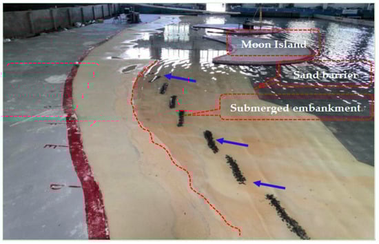 To further validate the repair case, physical model experiments were conducted to study the sand replenishment and loss situation, profile changes, and shoreline deformation of the beach at different elevations of the submerged embankment.