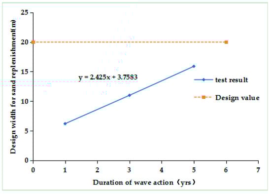 For the maintenance of shoreline erosion, the experiment took the width of the dry beach as the standard for the implementation of maintenance and used the regression width of the shoreline erosion under the continuous action of waves at different times for fitting. The relationship between the two is shown in Figure 11, and an empirical equation for beach maintenance cycle was fitted, as follows: