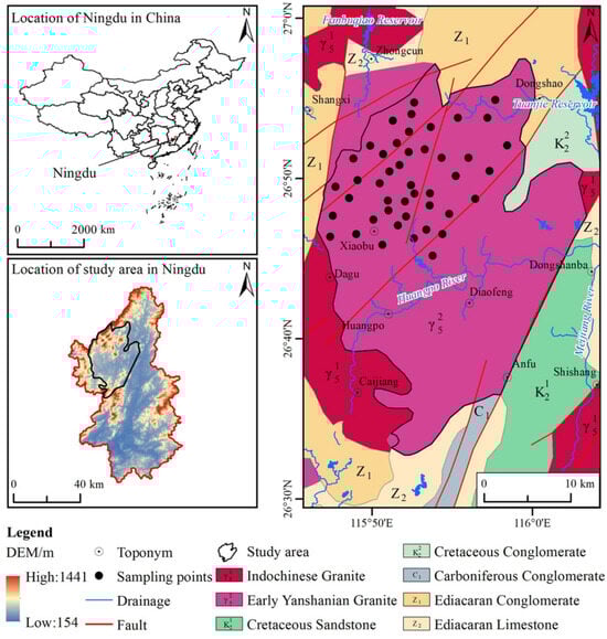 The Taoshan rock mass is situated in the northern part of the eastern segment of the Nanling Mountains, at the junction of the Yangtze Plate and the Cathaysia Plate, within the northern end of the Yushan Uplift Belt. It is bordered by the Ganzhou Basin to the left and the Yudu–Ningdu Depression to the right, exhibiting a northeast-trending tongue-shaped distribution. It spans approximately 40 km in length from north to south and 28 km in width from east to west, covering an area of about 1100 km2 [16,17]. The regional structure of the Taoshan rock mass is influenced by the NNE-trending Yingtan–Anyuan deep fault and the NE-trending Dayu–Nancheng deep fault zone, with predominant development of NE-trending and EW-trending faults, primarily characterized by brittle faulting and localized brittle–ductile deformation. The Taoshan Fault, the largest fault structure in the study area, is mainly thrust in nature and exhibits multiphase activity, often intersected by later NNE-trending or NW-trending faults and filled with dikes, contributing to the enrichment of minerals in groundwater.