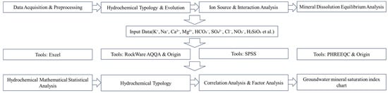 The study utilized SPSS 26 and Excel 2019 software to perform statistical descriptive analysis on various ion indicators in groundwater, determining the basic composition of groundwater and analyzing the distribution of each component. The hydrochemical software RockWare AQQA 1.5.0 was employed to construct Piper trilinear diagrams, elucidating the evolution of groundwater hydrochemical types. Gibbs diagrams were used to analyze the controlling factors of major ions in groundwater from three perspectives: atmospheric precipitation control, rock weathering control, and evaporation–concentration control. The ion ratio coefficient method was applied to explore the hydrochemical characteristics of groundwater, while correlation analysis and factor analysis were conducted to investigate the sources of ions. A detailed methodological flow chart for groundwater hydrochemical analysis is provided in Figure 2.