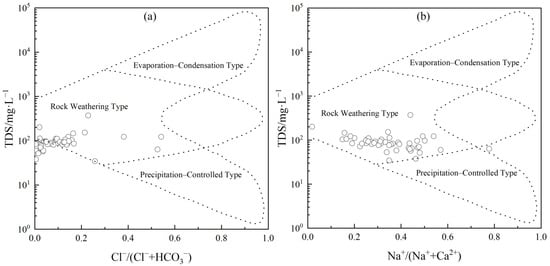 The Gibbs diagram, which plots Na+/(Na+ + Ca2+) against Cl−/(Cl− + HCO3−), categorizes the controlling factors of groundwater formation into three types: atmospheric precipitation control, rock weathering control, and evaporation–concentration control. In the Gibbs diagram, samples with low TDS (<10 mg/L) and high Na+/(Na+ + Ca2+) ratios fall within the atmospheric precipitation control zone, indicating dominant influence from atmospheric precipitation. Samples with moderate TDS and low ratios are located in the rock weathering control zone, primarily influenced by rock weathering. Samples with high TDS and high ratios are situated in the evaporation–crystallization zone, mainly affected by evaporation–concentration processes [25].