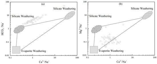 Bivariate relationships of ionic ratios in groundwater: (a) Ca2+/Na+ versus HCO3−/Na+; (b) Ca2+/Na+ versus Mg2+/Na+.