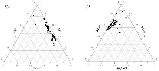 Ternary diagram of major ion composition: (a) Cationic components (Na+ + K+ versus Ca2+ versus Mg2+); (b) Anionic components (SiO32− versus HCO3− versus (SO₄2− + Cl−)).