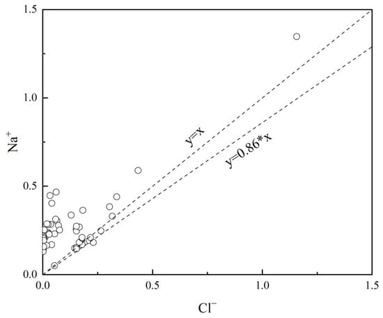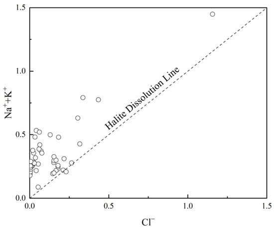 As shown in Figure 7, only one data point in the study area groundwater has a Na+/Cl− ratio less than 0.86, with a mean value of 21.54, which is significantly higher than the Na+/Cl− ratio in seawater. This indicates that the groundwater is not influenced by marine aerosols. The ratios are predominantly above the 1:1 line, with Na+ concentrations far exceeding those of Cl−. This suggests that the sources of Na+ and K+ ions in the groundwater are not solely from atmospheric precipitation and the dissolution of rock salt, but rather largely from the weathering dissolution of rocks.